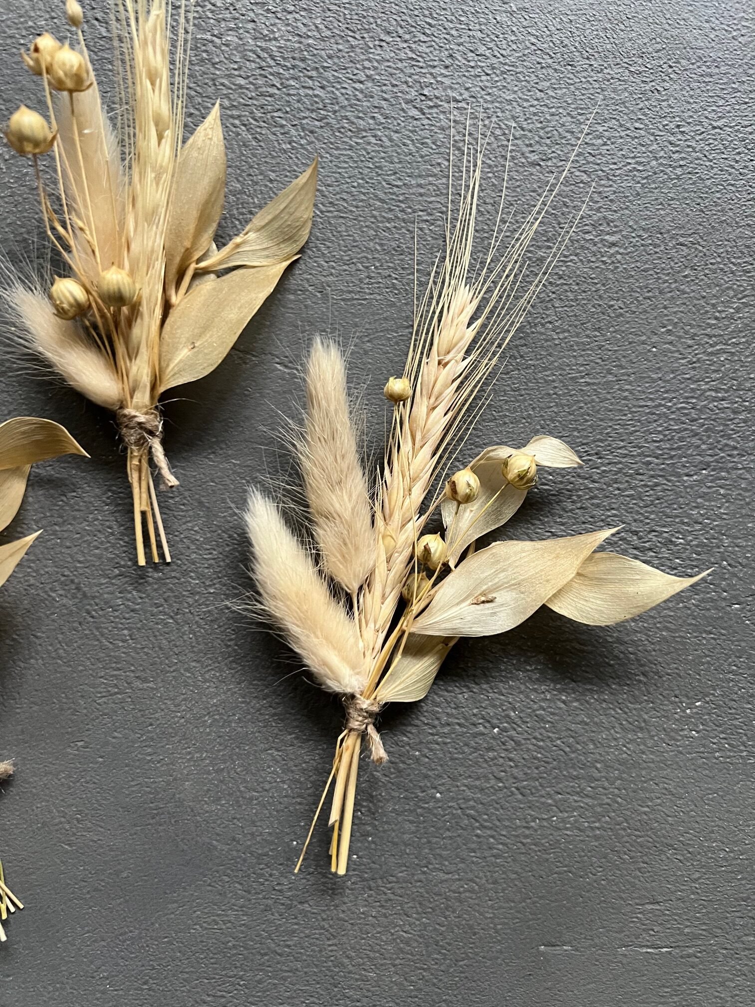 бутоньєрка виготовленна з сухоцвітів: пшениця вибілена, льон висвітлений, лагурус висвітлений, рускус бежевий