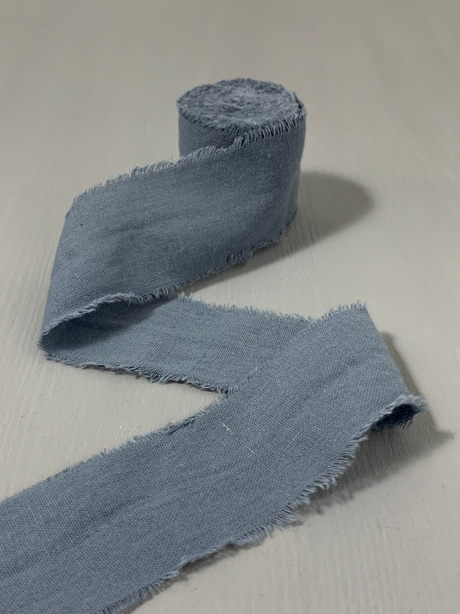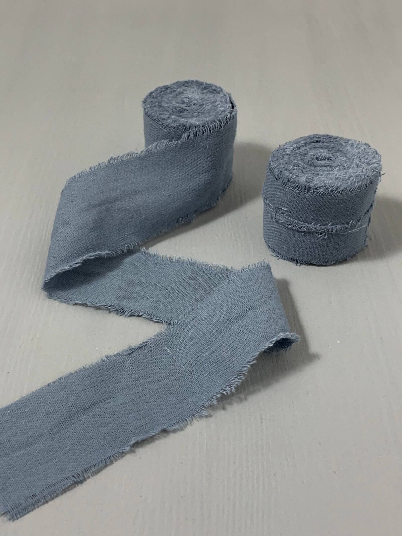 Бавовняна стрічка сіро-синя з необробленим краєм, ширина 4 см, довжина 470 см. Натуральна текстура й благородний відтінок роблять її ідеальною для флористики, весільного декору, упаковки подарунків та стильних handmade виробів.