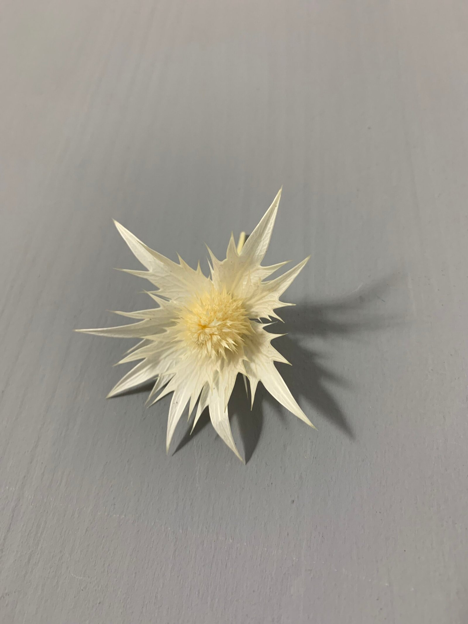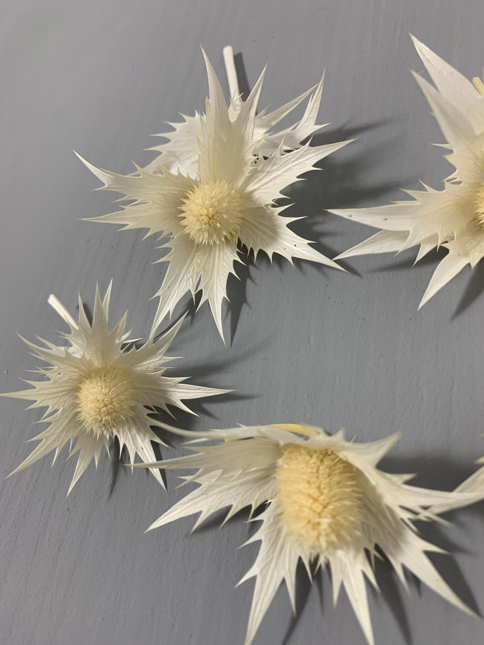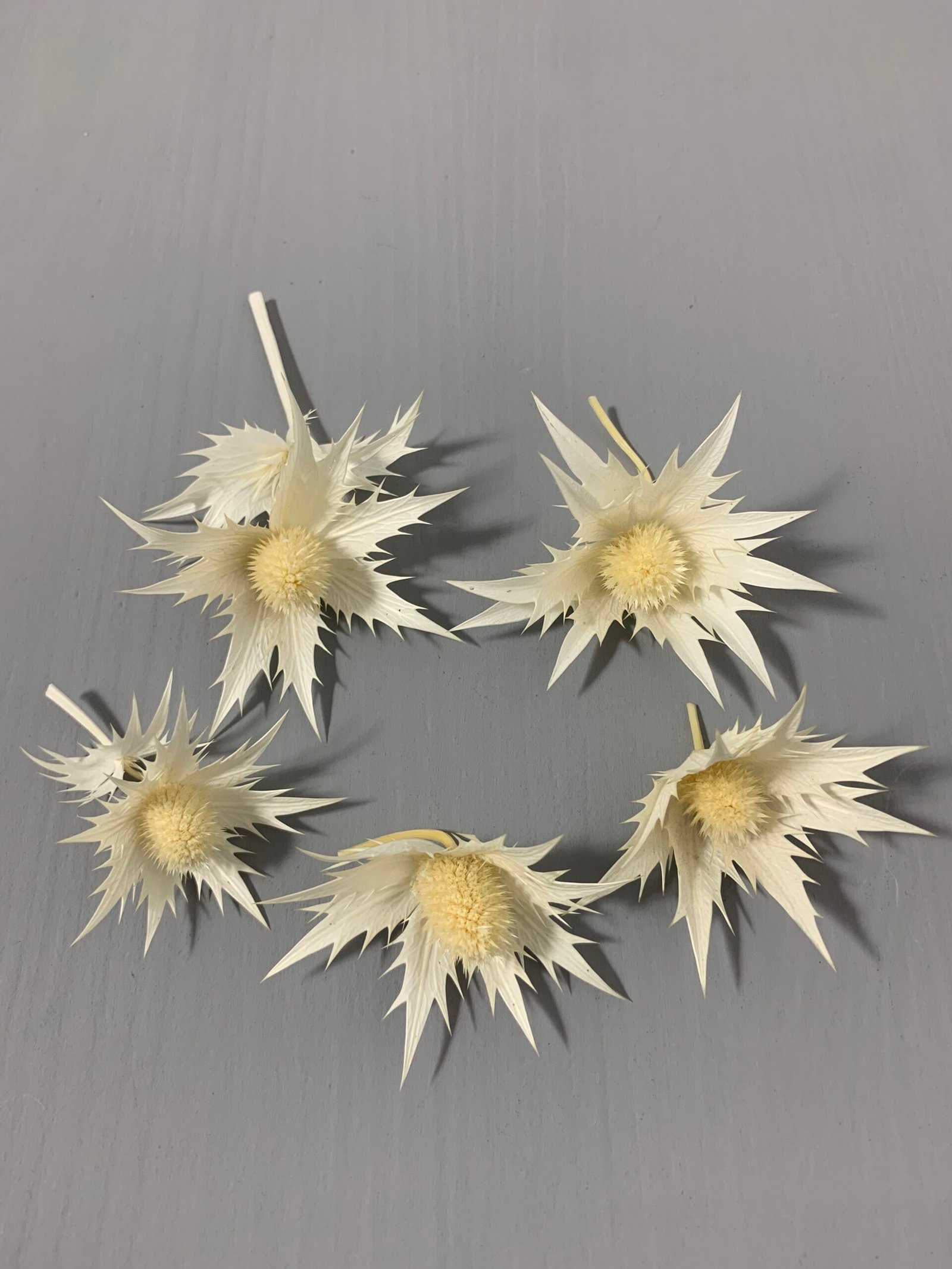 Ерінгіум стабілізований, вибілений, із діаметром 5–7 см та ніжкою 1 см – колючий сухоцвіт, який додає будь-якій композиції унікальної текстури та сучасної естетики. Його природна геометрія, вишукані контури та холодний відтінок створюють стильний акцент у букетах, вінках та інтер’єрних композиціях. Ідеальний для флористів і дизайнерів, які цінують деталізацію та індивідуальність у декорі.