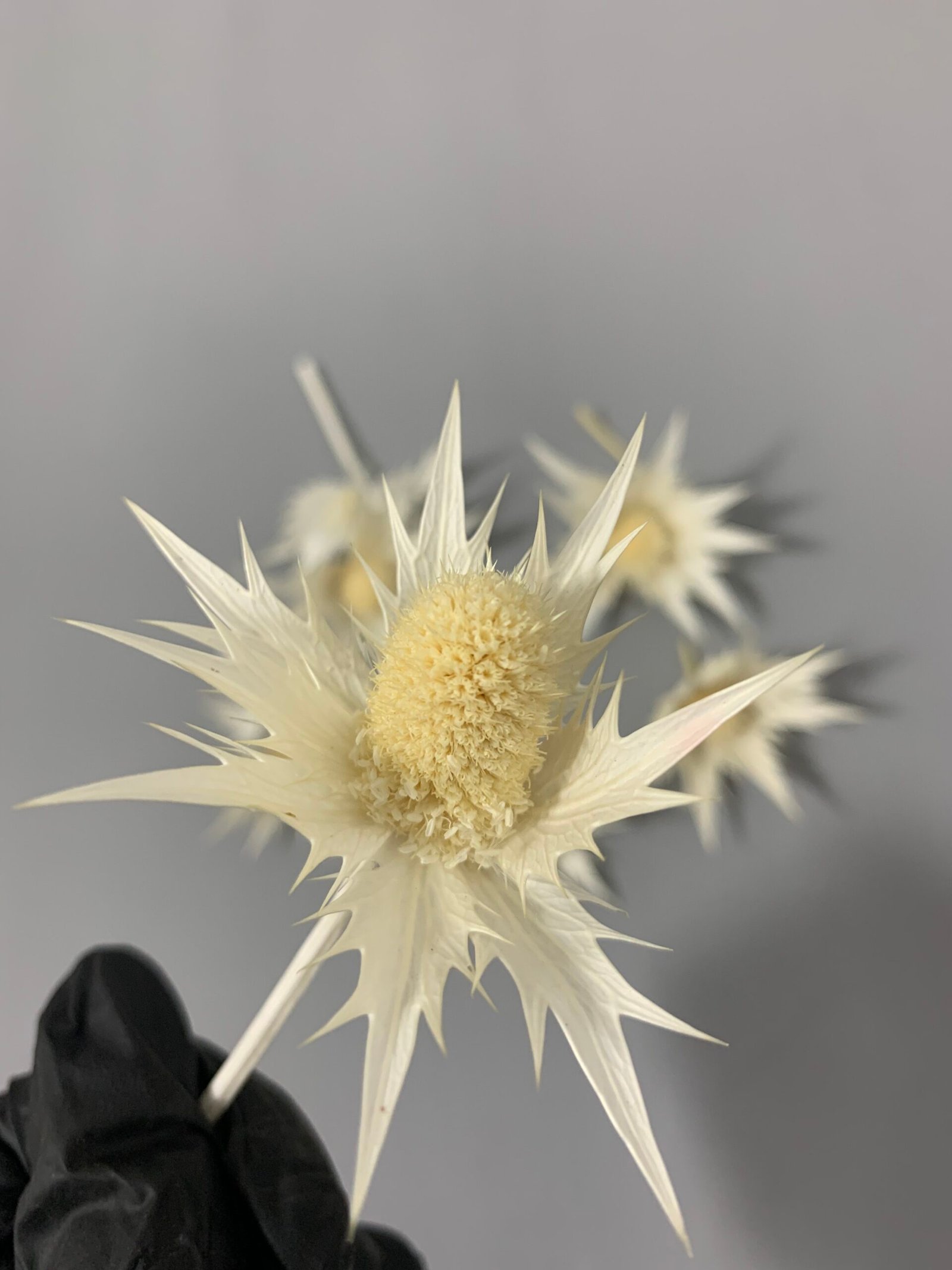 Ерінгіум вирізняється своєю колючою геометрією та неповторною текстурою. Вибілений відтінок надає рослині сучасного мінімалістичного вигляду, роблячи її універсальною для будь-яких композицій: від вінків і букетів до інтер’єрного декору. Колючий сухоцвіт легко поєднується з іншими стабілізованими та сухими рослинами, створюючи глибину, контраст і візуальний інтерес, який привертає увагу.