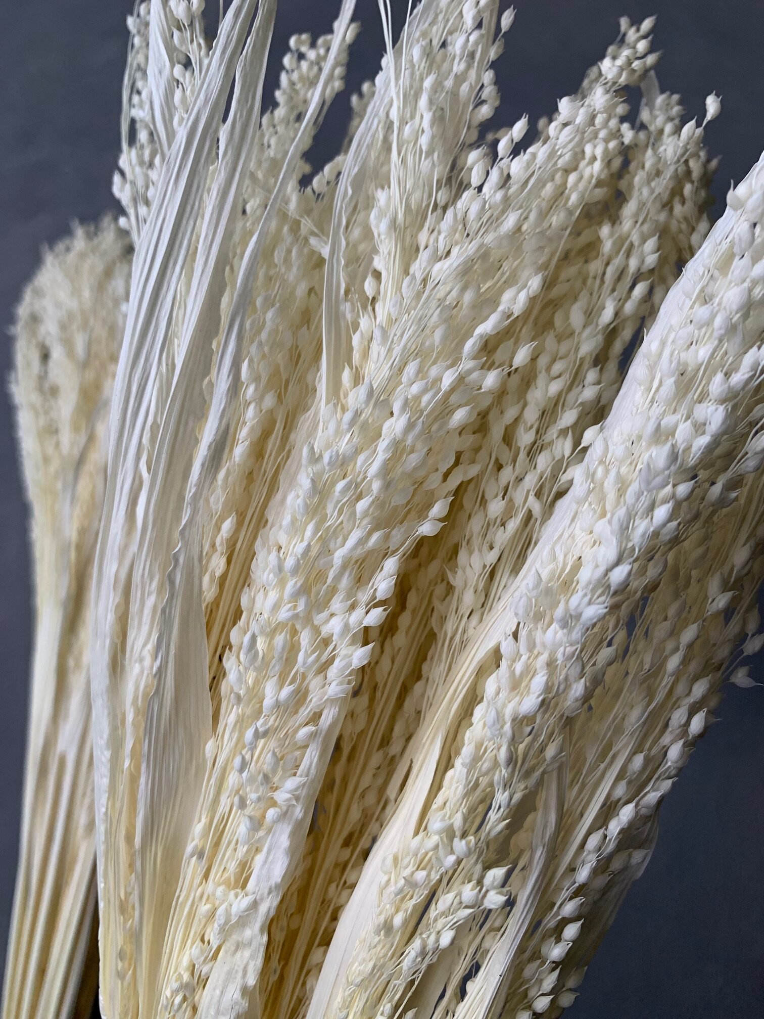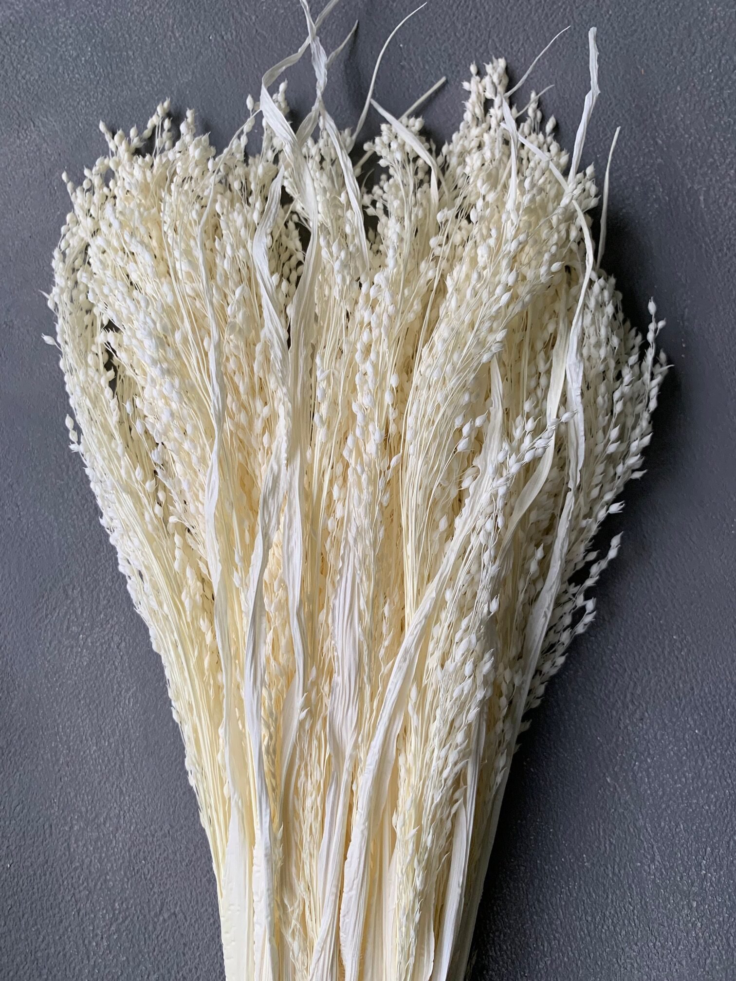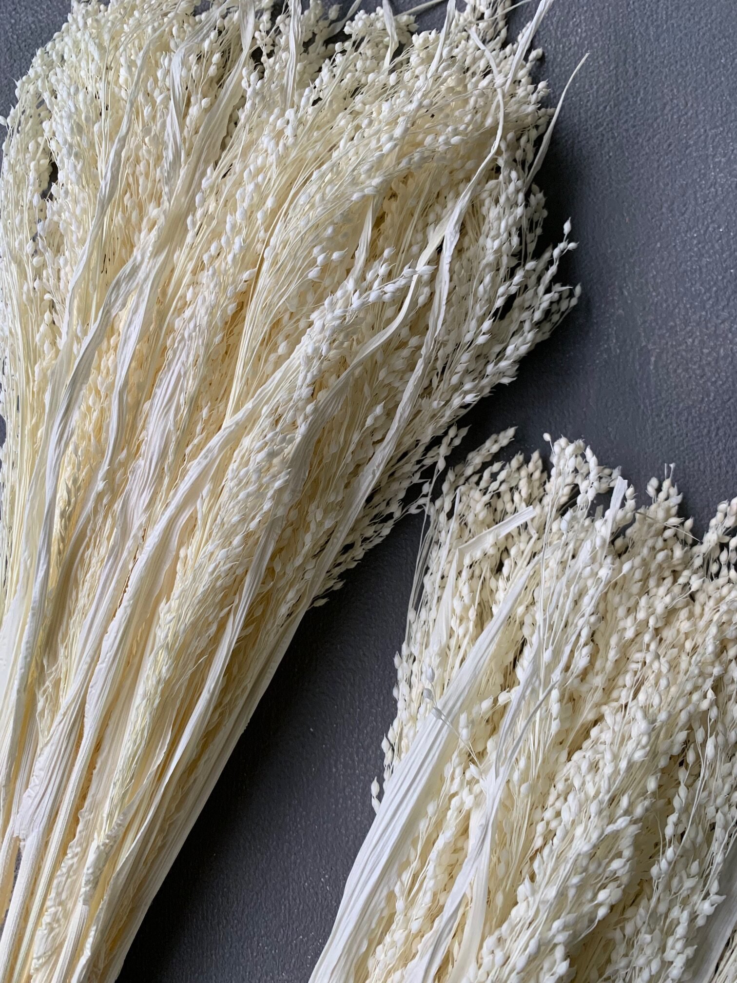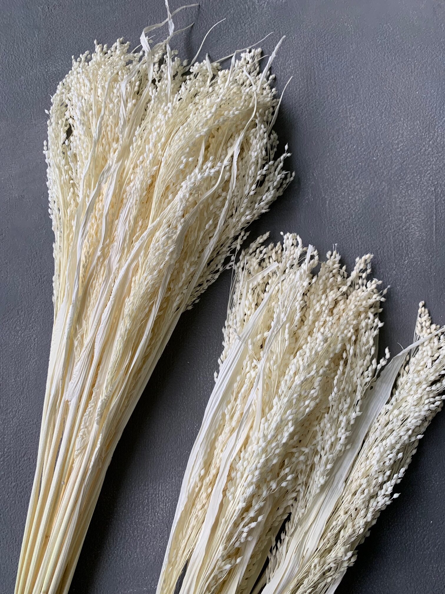 Вибілене просо — це легкість, витонченість і натуральність, втілені у кожній гілочці. Завдяки вибіленню, воно набуває ніжного світлого відтінку, який гармонійно вписується у будь-який інтер’єр. Його можна використовувати як самостійний акцент у вазі або як базу для складних флористичних композицій.