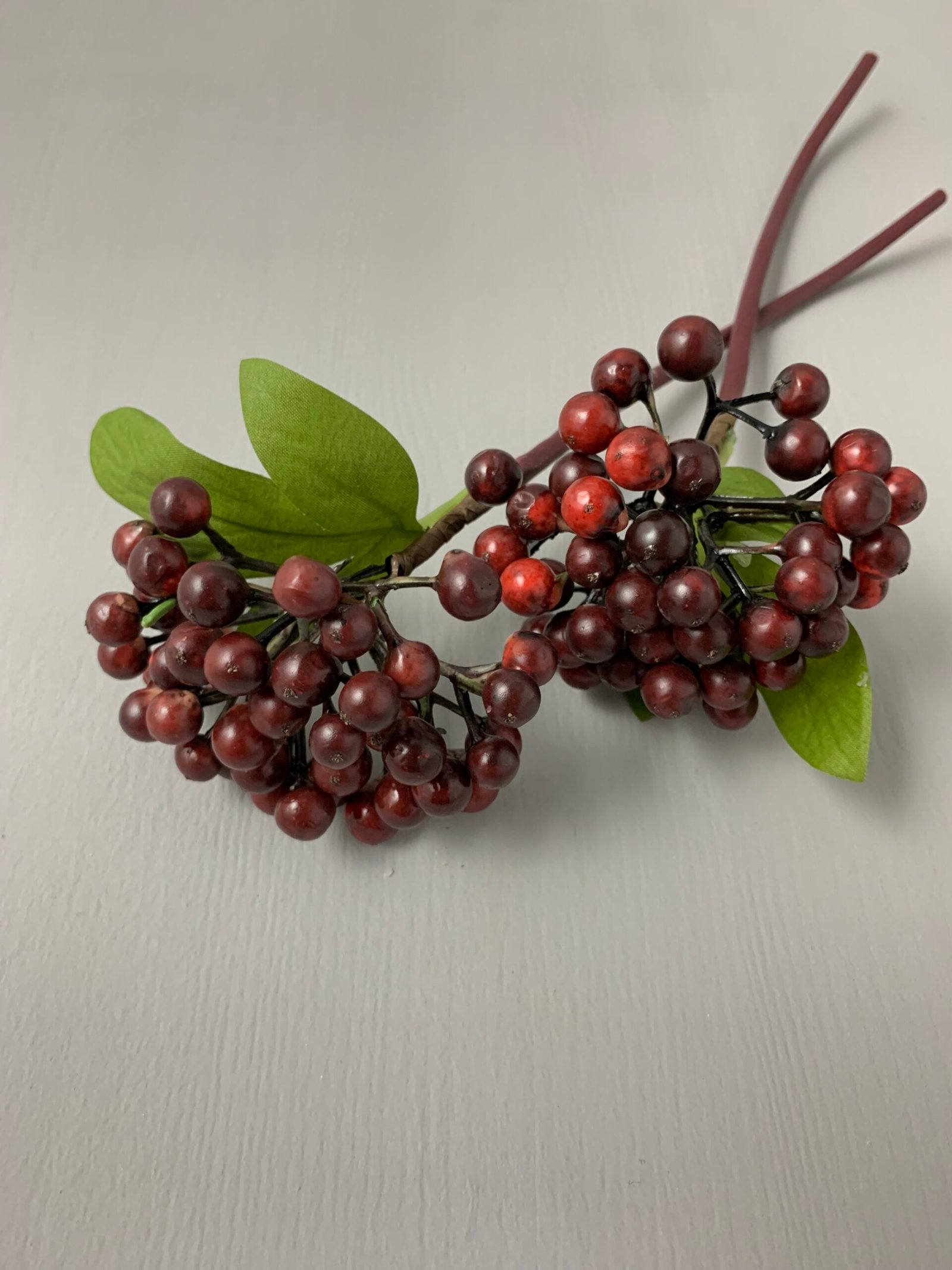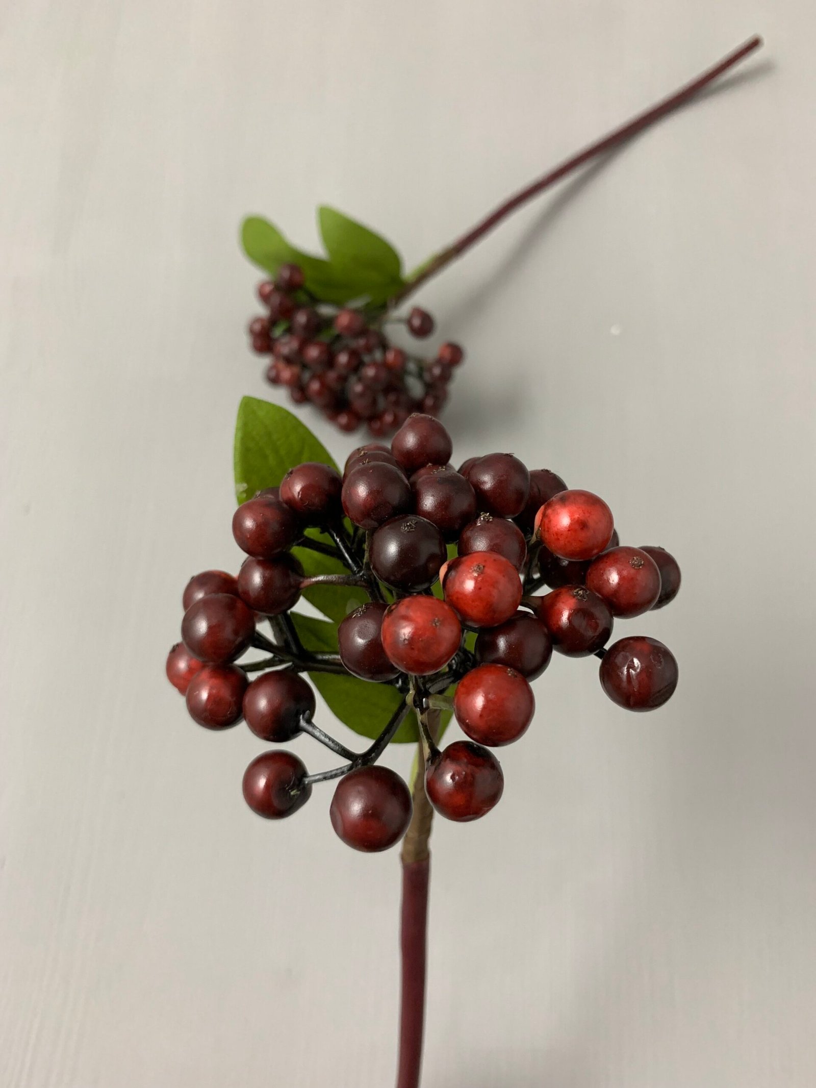 Бордові ягідки — це глибокий, насичений колір, що додає вишуканості і драматичності. Їхній діаметр 1–1,5 см створює ідеальний візуальний баланс, а невеликий листочок додає натуральності образу. Висота гілочки — 25 см — дозволяє легко вбудовувати ягідки в букети, віночки, топіарії чи новорічні декори.