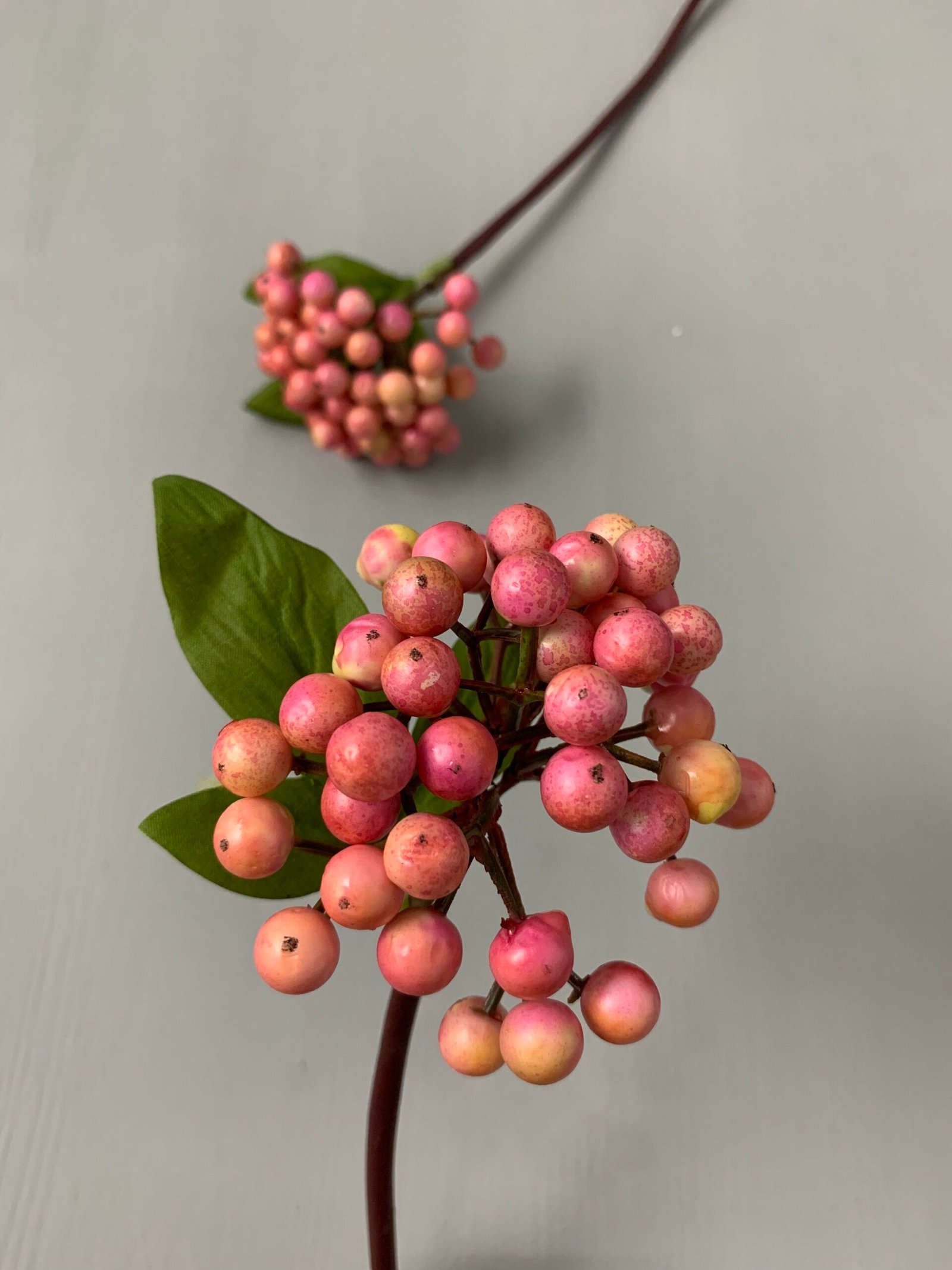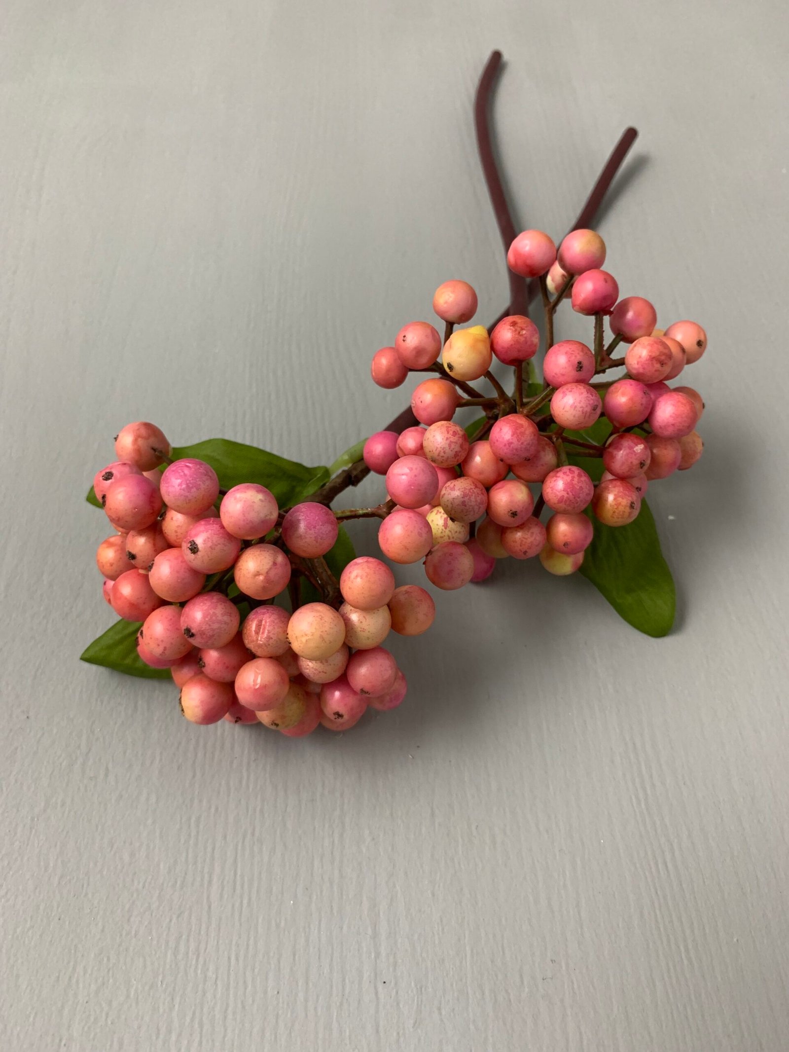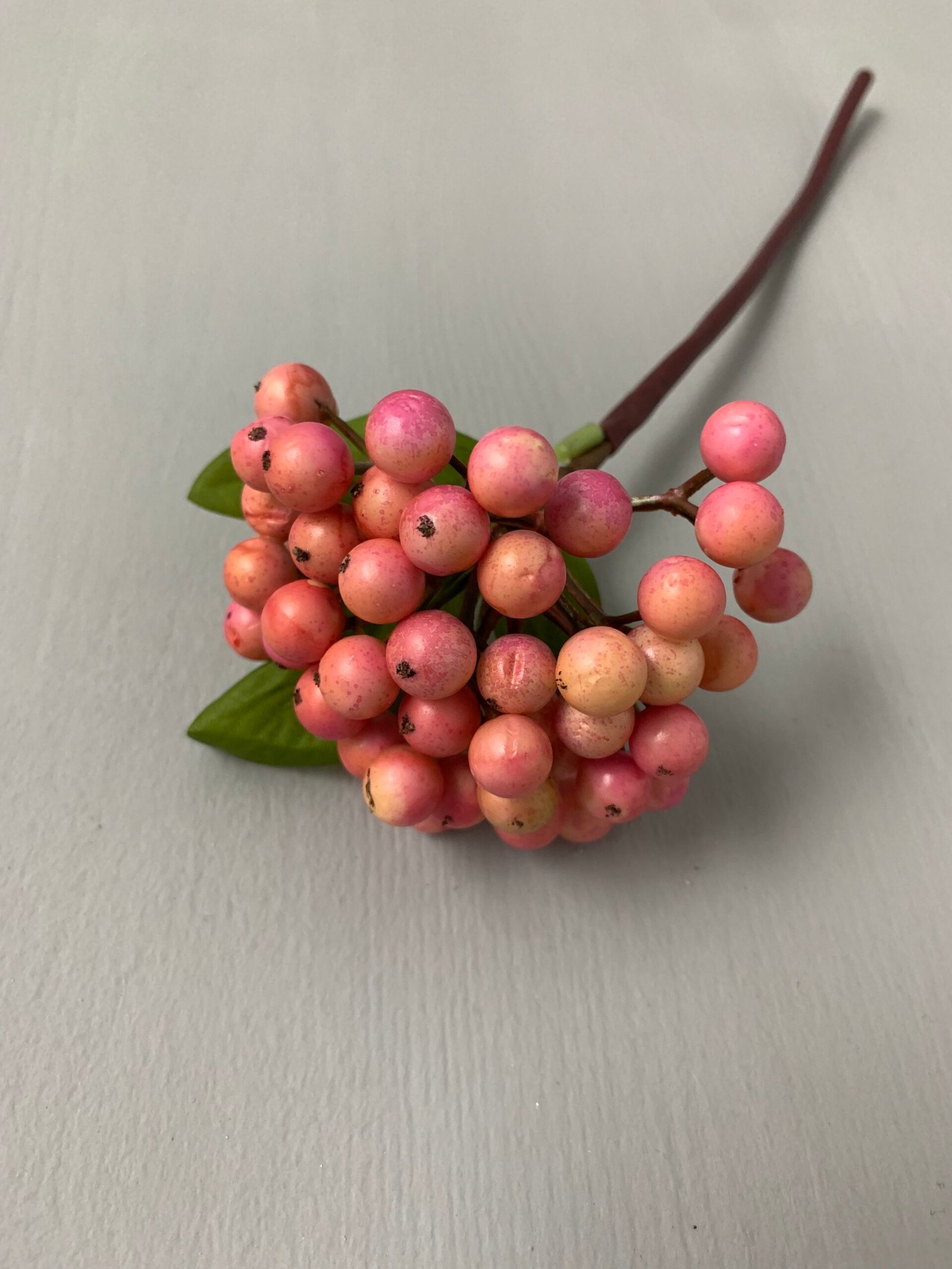 Штучні ягідки рожевого кольору з листочком на гнучкій ніжці (висота 25 см, діаметр ягід 1–1,5 см) — елегантний декоративний елемент для флористичних композицій, святкового декору, упаковки подарунків та творчих проєктів. Реалістичний вигляд і гнучкість забезпечують зручність у роботі та бездоганний результат.