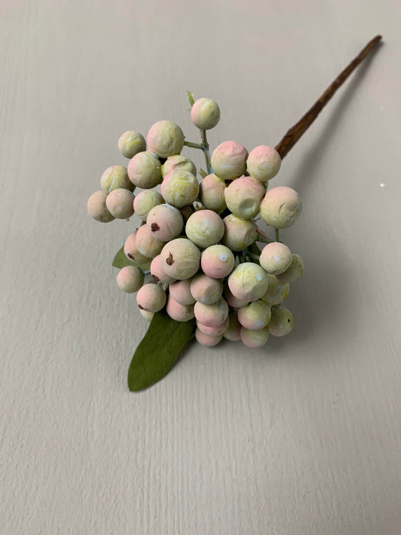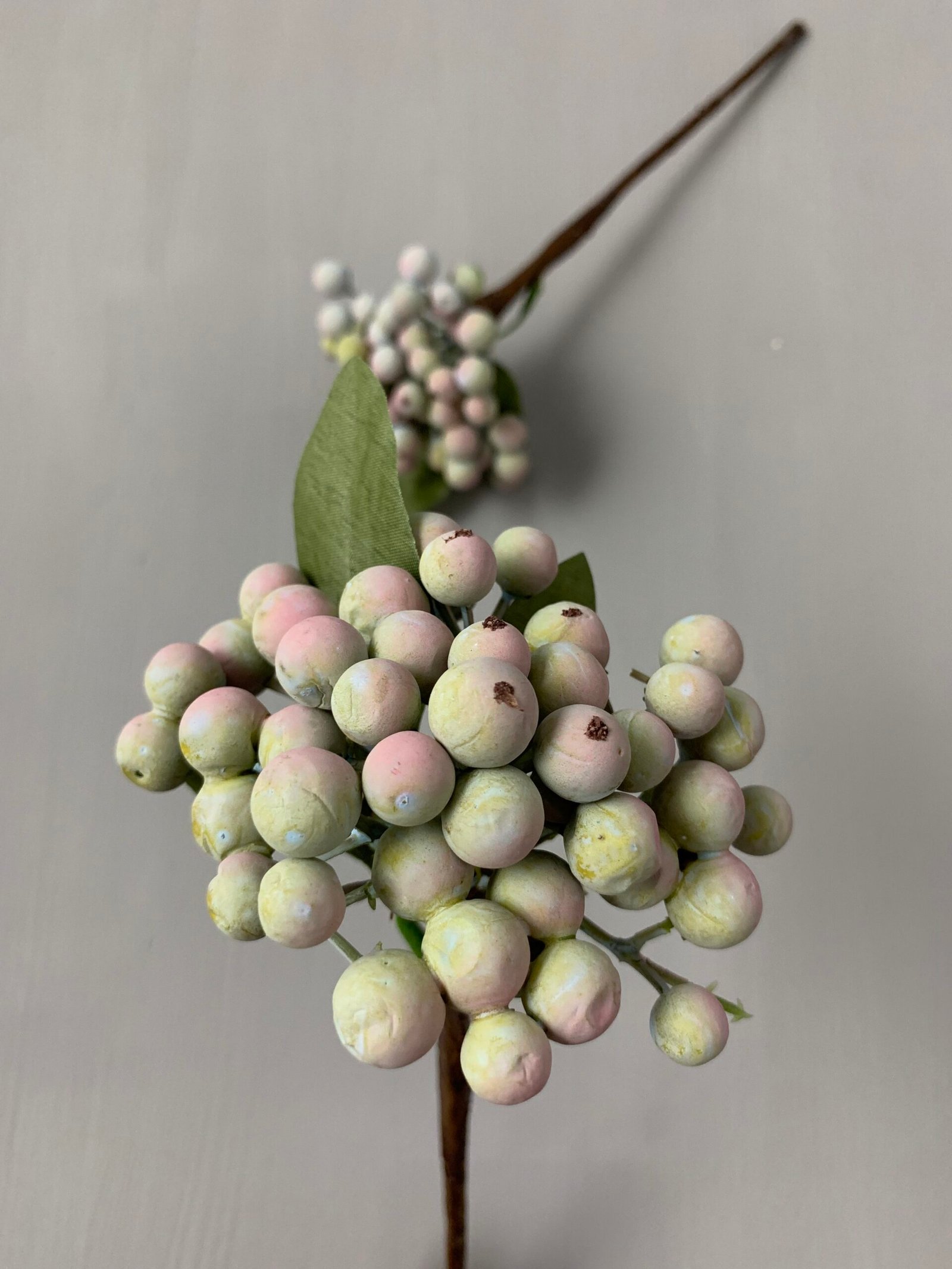 Штучні ягідки рожево-зеленого сизого відтінку з листочком на ніжці — витончений декоративний акцент для флористичних композицій, вінків, коробок та оформлення подарунків.